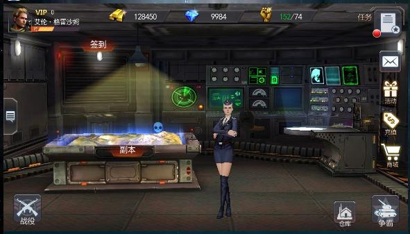 玩家进入游戏后会首先定位在作战室,这里是主场景中心,游戏内的主要PVE关卡“副本”、以及“签到”功能便是在作战室中,前往其它三个场景都是需要经过作战室的哦,已作战室为中心,向左滑动是车库,向右是档案室,向下则是荣誉室,如下: