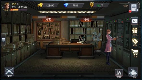 档案室在作战室右侧,这里包含了两个主要功能:好友与将领。好友就不用说了,玩家可以在这里与好友进行各种交互,要记得每天都来赠送/接受体力噢。将领则是游戏的另一大独特玩法,由著名将领驾驶的战车将可以得到大幅度的属性提升,而玩家对将领的各种操作,如招募、升阶等,都是在档案室进行的噢。