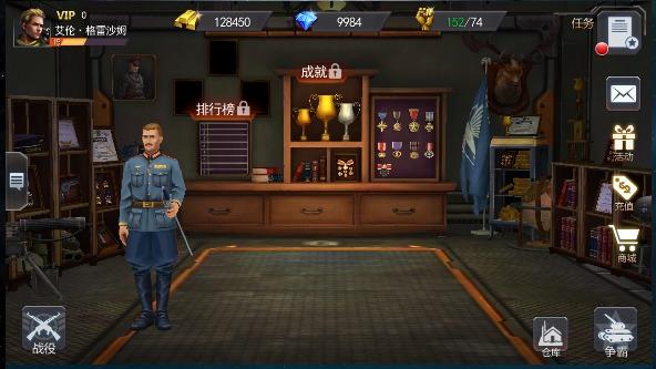 同时,简单介绍一下游戏内主界面功能分布。主界面上方依次分布为玩家个人信息,主要资源:钻石、金钱以及体力等的储存量;主界面左方消息图标,可打开游戏聊天系统;主界面右方,从上向下依次分布着任务、邮件、活动中心、充值系统、商城等;主界面下方从左向右依次是战役系统、个人仓库和争霸系统,其中“战役”主要包含了游戏中的PVE系统玩法:血战西西里、抢滩登陆、以及后续系统玩法等,“争霸”系统主要包含了游戏内的PVP玩法:个人竞技、天梯匹配等。
