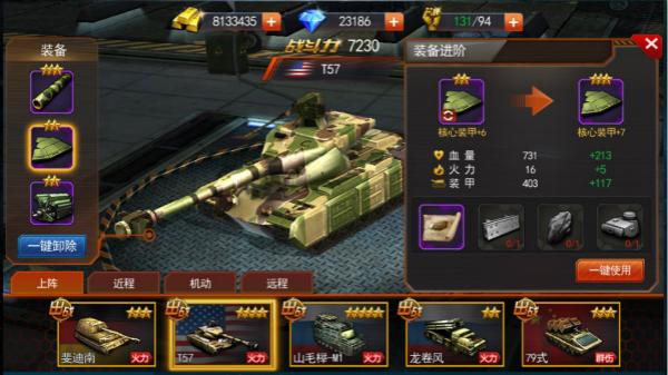战车的基础装备有三种:火炮系统、核心装甲、动力装置,装备可进行升阶,升阶所消耗材料可在副本掉落中获得。装备可进行卸下操作,升阶上限受战车品质影响