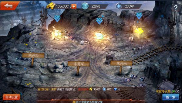 打开战役系统,选择能源矿井,即可进入到您的矿产领地了,这里盛产金币和积分。这里并不是世外桃源,在您看着矿井大丰收的时候,也隐藏着来自四面八方的威胁。玩家在开采过程中,可能被其他玩家掠夺,若防守失败,则会损失少量资源。当然您也可以选择简单直接的抢夺他人矿井,抢夺成功可以获得部分资源和少量钻石噢。咳咳,请注意是钻石噢!!