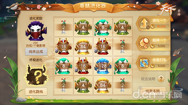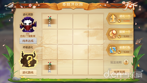 相同的草精会合体进化为更高阶的草精!草精的阶级由下方的分数值体现,也可以点击左下角的进化路线查看!