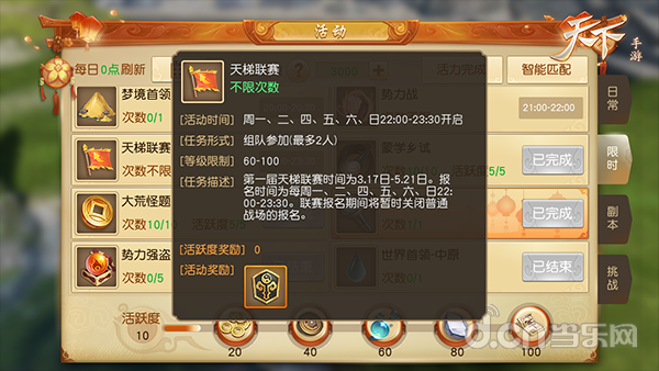 《天下》手游第一届天梯联赛正在火热进行中,60级以上玩家且服务器开启了跨服战场,即可参加天梯联赛!全新天梯战场不断更新PK玩法,新战场的匹配系统会根据玩家的战场表现积分进行分组,同时分为60-69级、70-79级,80级三个等级段,让玩家尽可能与自己同水平的对手进行竞技,最大程度保证赛事公平!随着少侠天梯战场积分提高,排名也会逐渐上升,当上升一个组别的时候,对战对手水平也会发生改变,让诸位少侠尽情体验攀登乐趣!
