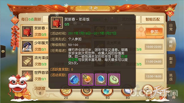 为了迎接天下少年在大荒度过的首个新春佳节,《天下》手游将现代流行和传统习俗结合,在打造迎新春特别舞会的同时,也特别准备了迎年兽与年夜饭等环节。截止至1月25日,30级以上的玩家可每日在19:00、20:00和22:00三个时间段内,在九黎指定区域翩然起舞,每场舞会持续时间为30分钟。在一言不合就跳舞的同时,玩家还可能获得经验、雷音溟钻、月威溟钻等珍贵奖励。