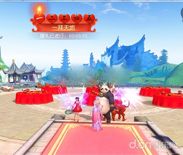 在两人宣誓结为连理后,即可换上华衣锦缎、金绣红妆来举行婚礼。在秀丽的江南举办酒席大宴亲朋,新婚两人成亲的信息也将昭告天下,让大荒所有人见证这段浪漫的关系。之后新人邀请的亲友可通过情缘仙姬,进入私密的婚宴现场。正如现实中的婚宴一般,喜宴至上新人入拜天地,行合卺交杯之礼,礼毕之后更可坐上大红花轿,穿上锦绣华缎金龙金凤巡游江南。