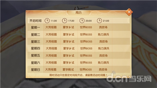 估计很多人都会忽略左上角的周历,周历的作用是为了能够让玩家更加详细的知晓每一周的一些活动开放时间,这样能够让玩家合理的安排好自身的上线时间,能够更加详细的跟进到任务活动当中,参与进来。