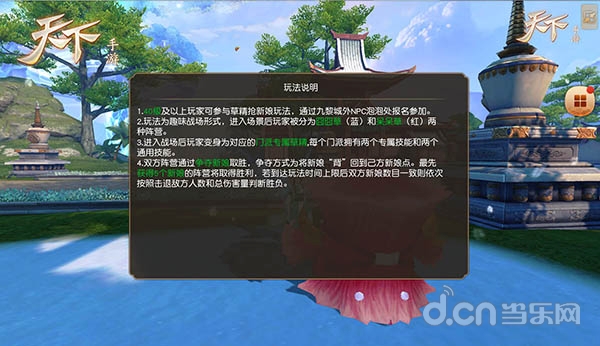 进入场景后,玩家们先会被分成囧囧草(蓝色)和呆呆草(红色)两个阵营,然后摇身一变成为其对应的门派专属草精。从对方新娘点或祭坛抢夺5个新娘,护送至本方新娘点,便可取得胜利。为了加强在玩法上的技巧性和多样性,每个门派从一开始便拥有两个通用技能和两个专属技能,如何搭配组合不同门派间的专属技能就成了在竞赛中胜出的关键点了。