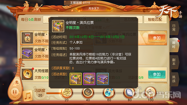 作为《天下》手游首届全明星联赛,跨服竞技赛与演兵争霸赛连番袭来,只为《天下》手游玩家奉献精彩绝伦的大荒盛宴!这场年末压轴好戏绝对不只是参赛玩家的狂欢,更是每一位大荒少侠的庆典:用投票为势力助威,用鲜花给战队献礼,用自己的参与影响全明星战局,更有机会获得福利好礼。趣利双收美哉乐哉,快与势力战队一起共谱大荒新篇章。