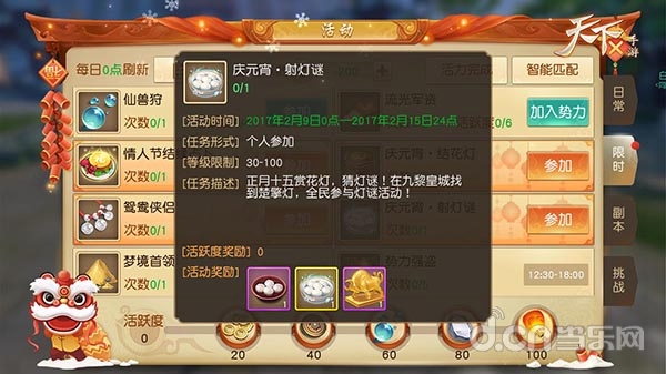 正月十五赏花灯,猜灯谜!2月9日更新后至2月15日,玩家可前往九黎皇城,楚擎灯为各位少侠精心准备了元宵灯谜,30级及以上的玩家都可前往挑战。不仅可以获得金牛奋蹄、元宵等奖励,还可搜集元宵节庆专属的花灯材料。