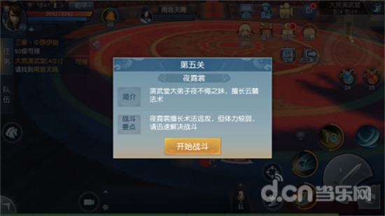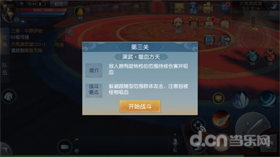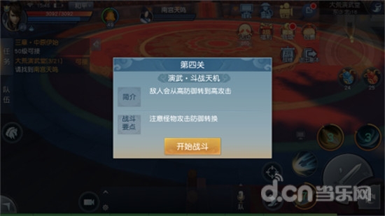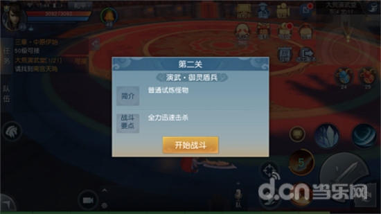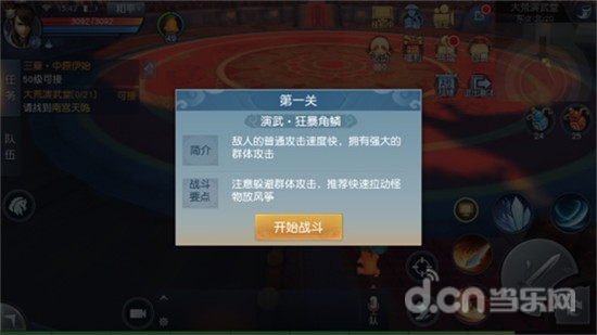 进入大荒演武堂后,看到地图有个问号的,直接跟着地图走到“NPC南宫天鸣”处,点击与他噼里啪啦的一大堆废话后,即可开始任务了。任务的关卡总共分为21关。每个关卡的任务都不一样,而且每关在开始之前都会有特地的简介、战斗要点等说明。