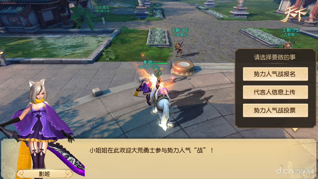 即日起至5月22日0点,成员数量大于等于10人的势力均可报名参赛。由其势力主或尚书可点击“活动”按钮中的“势力人气战”寻路至npc“影姬”,点击npc后可选择“势力人气报名”即可打开报名界面。
