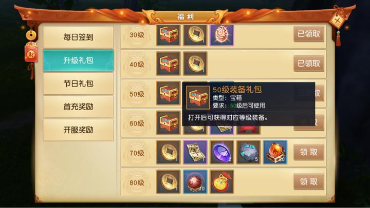1、 升级礼包。每升10级礼包,系统会送一个升级礼包,里面含有装备套装,而且装备属性还是不错。