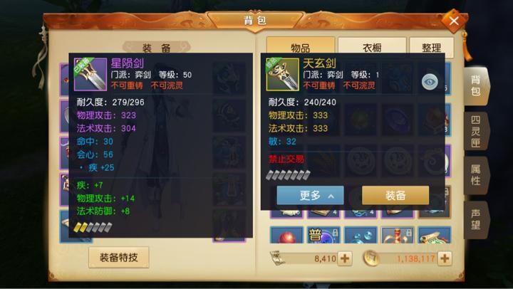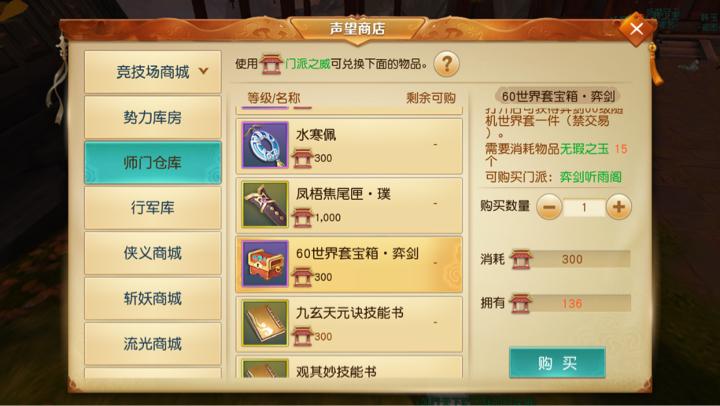 4、 师门仓库。师门仓库的装备可以用门派之威兑换,属性也很不错,但是装备等级比较高。此外,师门仓库里面还有60世界套。