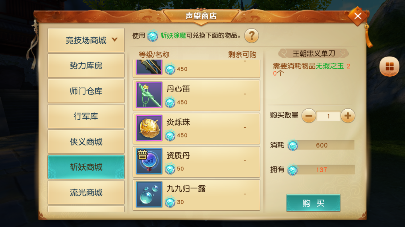 5、 势力仓库和斩妖商城。势力仓库和斩妖商城里面也能够通过积分来兑换相应门派的装备。