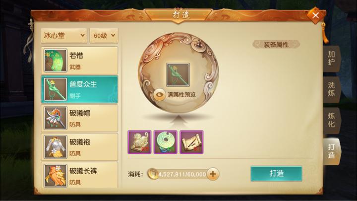 首先,我们先要明确:作为0元党,我们追求的不是一时的快乐,而是未来更强大的自己。所以,我建议先使用升级礼包送的装备过渡到60级。如果在做任务的时候得到了更好的装备,也可以把系统送的装备换掉。到了50级可以打造了,但是我建议大家忍一忍,握住自己的小手,别那么快打造装备。因为到了60级,50级打造的装备就跟不上了。那么到了60级我们又要重新打造新的60级装备,而打造60级装备所需要的材料是50级材料的几倍。所以我建议大家60级以前还是努力刷本做任务,乖乖的把师门的门派之威存起来、势力的势力贡献和斩妖的斩妖除魔存下来,把打造装备所需要的麒麟璧、凤血环、玄武晶等材料也好好的存起来。到了60级我们就可以好好的打造自己所需要的装备和兑换师门的世界套以及其他装备。