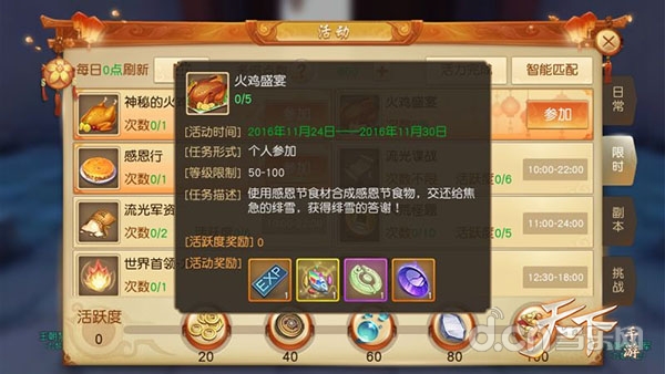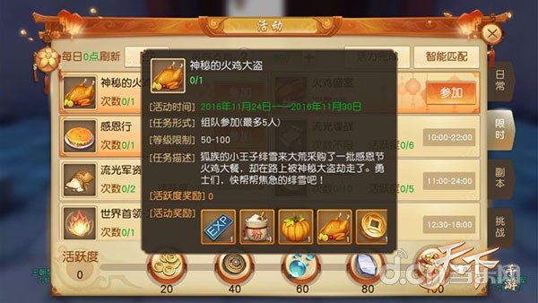 感恩节食材一共有“火鸡”,“南瓜”,“面粉”三种。少侠们收集齐三种食材可制作感恩节食物,把食物提交给绯雪可获得五仙石、圣灵软玉、月钻等丰厚奖励。即使错过了某环任务没有获得足够的食材也不要紧,在活动期间,玩家亦可使用活力值购买超值优惠券以及感恩节食材。