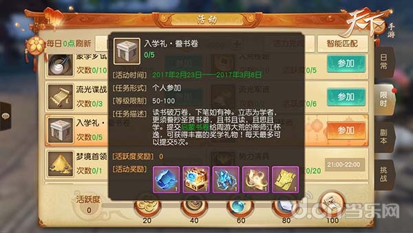 读万里书,行万里路。参与大荒开学礼,怎少得了誊抄圣贤书卷。帝师下江南,以奖学礼物广收启蒙书卷。2017年2月23日更新后—3月8日24时,50级以上的玩家在完成日常任务时会随机获得誊写书卷的材料,可用来合成启蒙书卷匣。开启书卷匣可随机获得一种启蒙书卷,将启蒙书卷提交给江怀逸,可获得雷音溟钻、天域真火等丰厚学子奖励!