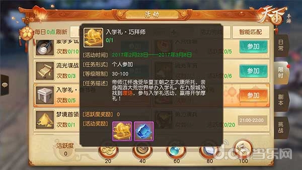 名师出高徒,良师在侧方能共战大荒。开学季活动期间,30级及以上的少侠可在九黎城外寻找璎珞并开启巧拜师旅程,击败前来捣乱的敌人并回答帝师江怀逸的问题,便可获得金牛奋蹄、雷音溟钻等丰厚奖励