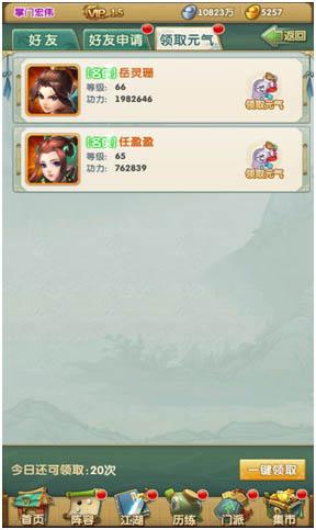 领取元气:展示当前可以领取好友赠送元气的次数、剩余可领取次数、可使用一键领取直接领取