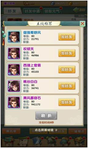 系统推荐:如需快速添加好友,可通过此系统进行好友添加,此系统会推荐与自身等级或者功力相近的其他玩家