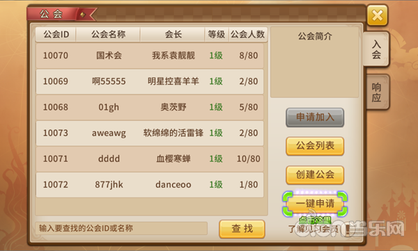 想要加入公会的玩家,点击主界面“公会”按钮。点击任一公会加入或点击“一键申请”即可。