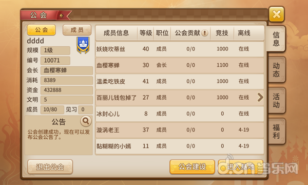 显示公会规模、资金、公会公告等信息及成员等级、职位、公会贡献、竞技实力、积极度等信息。