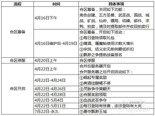 本次合区预计4月16日开启合区前维护,关闭部分功能;4月20日正式关闭待合服务器;4月22日完成合区操作开启合并后服务器。在此期间,还将有各种福利活动恭候大驾!具体细则如下: