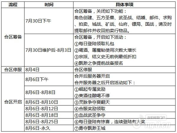 本次合区预计7月30下午开启合区前维护,关闭部分功能;8月4日正式关闭待合服务器;8月6日下午完成合区操作开启合并后服务器。在此期间,还将有各种福利活动恭候大驾!具体细则如下:
