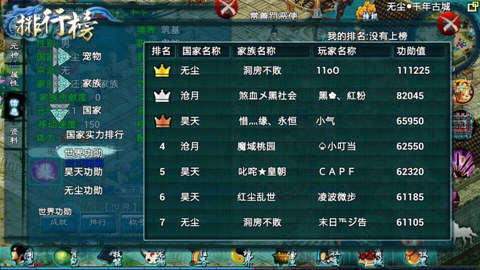从功勋值来看,三国在世界功勋排行榜的排名与国战排名简直是大逆转,【无尘】更是以111225的功勋值居于首位。无奈【昊天】人数庞大,才落得一直被压制的局面。那个,是不是该考虑一下招募一些新朋友呢?值得各国天尊、管理员们思考啦!