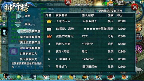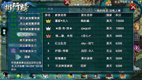 从【家族排行榜】来看,【域外之战】中有实力的家族多集中在【昊天】,可见【昊天】中各家族的族长对于管理家族、协调家族的能力比较强。但是我们在榜单上也看到了【沧月】的【卐新竹联帮卐】与【无尘】的【护国~帝都】,这两个家族如同一匹黑马杀进【昊天】独大的排行榜,也算是一个奇迹!