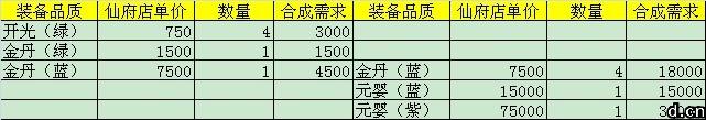 通过这个表,应该很好理解吧。但是考虑到仙府商店里兑换到的装备是随机的,所以,如果真想合成某一件装备,我们会选定一件装备为目标装备。换句话说,目标装备的兑换材料会被省下来,那么真实合成所需的材料会比表中显示的还要少。可见玩仙府换装备是不可忽视的吧。