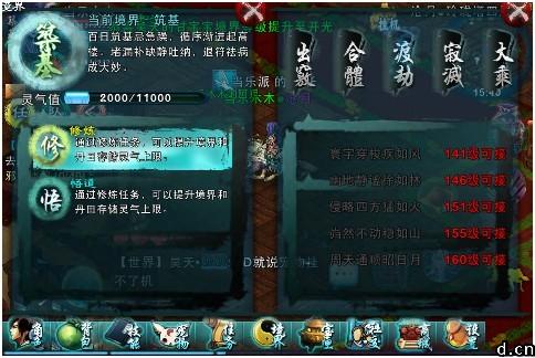 境界系统:玩家通过渡劫来提升境界历练,将获得更高的角色属性。按玩家完成境界渡劫的阶段分为炼气、筑基、开光、金丹、元婴、出窍、合体、渡劫、寂灭和大乘十级品阶。玩家在当前境界积累足够的灵气值,可进行渡劫。进入效果绚丽的打坐状态,完成打坐将渡劫成功,玩家自然进入下一境界。