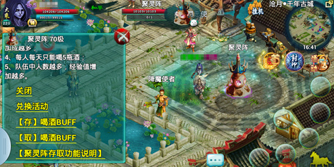 修仙路上最怕半途而废,喝酒时候最怕一饮未尽!即将推出的全新玩法【聚灵阵存取】将有效帮助你解决这个问题!如果你正在喝酒,临时有事不能继续,那么你就可以选择把喝酒的BUFF存起来。在你下次时间充裕的时候再取出来,继续喝酒涨经验。这里,小编要透露个小秘密,存酒的BUFF只能保存3天哟,如果超过3天,那就是亲的损失咯!