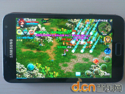 登入游戏后,迎面扑来的感觉有点让人窒息,你会发现游戏画面在手中流淌,对,我形容的就是三星GALAXY Note对《忘仙OL》游戏画面表现效果,不得不惊叹AMOLED材质屏幕的完美。索性将屏幕背光调至最大,居然没有耀眼之感,这无疑对玩网游需长时间面对手机屏幕的玩家来说是个惊喜。