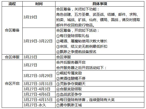 本次合区预计3月19日开启合区前维护,3月23日正式关闭待合服务器,3月27日完成合区操作开启合并后服务器。在此期间,将有各种福利活动恭候大驾!具体细则如下: