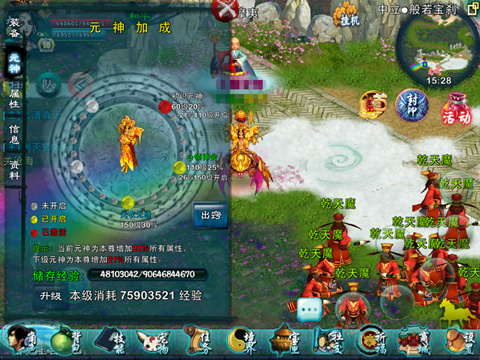在新资料片“中天伏魔”中,【元神】按等级暂时开启:初识元神、心领神会、天衣无缝三个阶段,每一个阶段都会有相应的属性加成,等级越高,属性加成越高,战斗力也就越强!在不远的将来【元神】还将开启更高的阶段,让仙友们畅享高等级属性加成的诱人福利,让仙友们的【本尊】战斗力扶摇直上,让仙友们在冲神之路上,尽显英雄豪气、王者雄风!