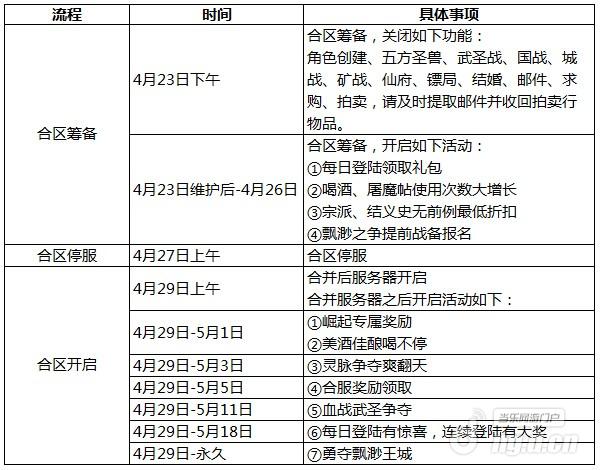 本次合区预计4月23日下午开启合区前维护,关闭部分功能;4月27日上午正式关闭待合服务器;4月29日上午完成合区操作开启合并后服务器。在此期间,还将有各种福利活动恭候大驾!具体细则如下: