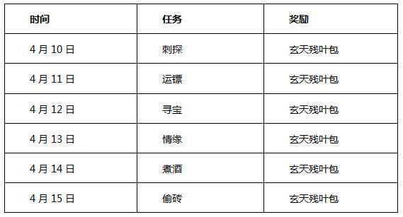 活动规则:活动期间,在指定日期做指定日常任务,额外加送玄天残叶包。具体安排如下: