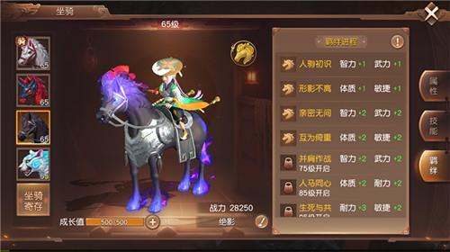 坐骑拥有四个坐骑技能的位置,分别在坐骑等级达到10级、20级、30级、40级时开启,坐骑技能同时可以最多辅助两名不同武将,为其带来属性加成。坐骑技能将随着技能阶数提升而解锁,玩家可通过驯马令提升坐骑的星数从而升阶,坐骑每提升一阶还将获得一次免费修改技能的机会。