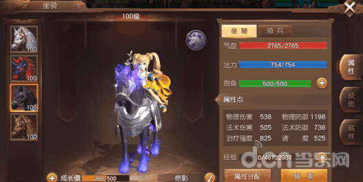 40级开启的坐骑系统,对于各位英雄来说更是如虎添翼的存在。战斗中上马,可以蜕变为骑兵获得全新技能,可以分分钟逆转战场的乾坤。与此同时,每匹战马还能辅助两名护卫,为护卫添加新的战斗属性。总而言之,一匹战马,能让每个战场都充满无限可能。你,值得拥有!