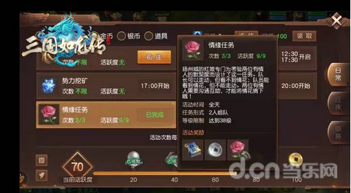 另外,每天还有有趣的情缘任务等着少侠:情缘任务只能两人组队完成,不仅玩法新颖浪漫,还能拿经验、拿银币、拿礼物。