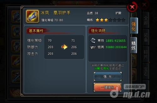 强化需要消耗生铁和银两,在强化的时候我们可以选择强化或一键强化;