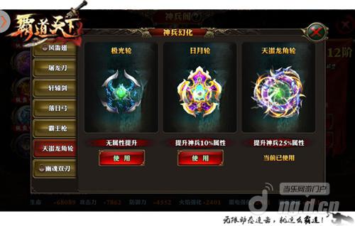 新版的神兵系统新增幻化功能,外形更炫,属性更强。需要消耗一定的元宝将初始极光轮幻化为日月轮,天蚩龙角轮,其中日月轮可额外增加10%属性,天蚩龙角轮可额外增加25%属性。
