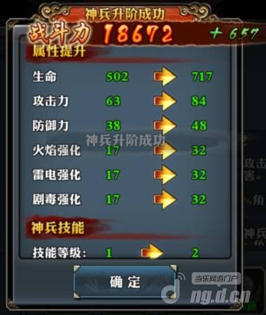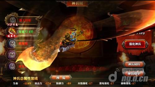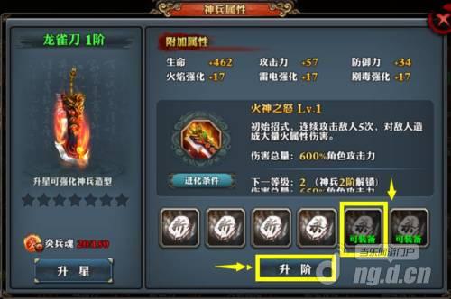 在神兵主界面点击“强化神兵”,用卦文为神刀升阶,每装备一枚卦文都可以增加此卦文为神刀带来的新属性。我们在提升神刀属性的同时能让神刀的基础招式火神逐渐进化演变,改变招式特效的同时大幅提升招式的伤害!