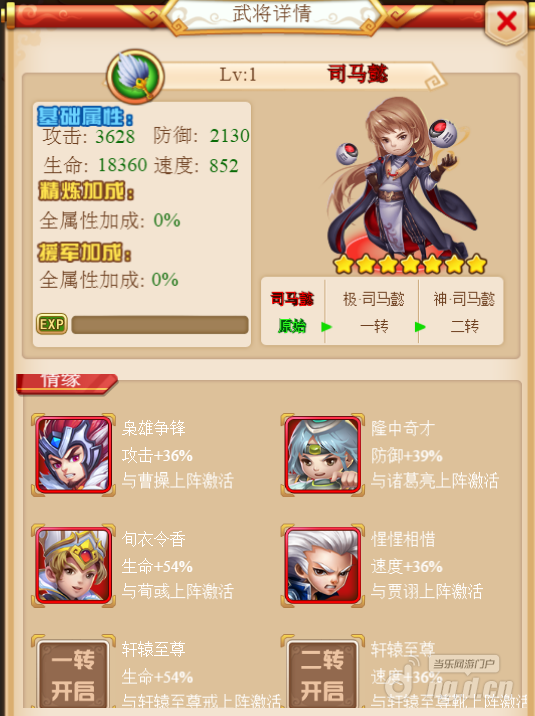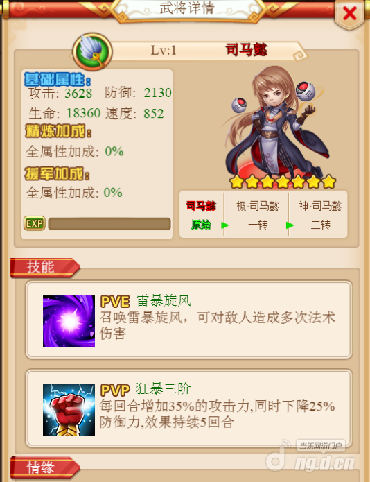 司马懿基础属性比普通七星武将多加%10。PVE副本技能雷暴旋风能对敌人造成多次法术伤害!兵种是军师,群体攻击带燃烧效果,在副本能把集中在一起的怪统统消灭掉。竞技场技能加强%35的攻击力下降%20的防御,技能仅次于神将吕布之下!