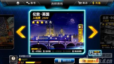10级后可进英国伦敦场地,入场费2000,底分500,完成“一杆清台”、“连杆数”、“剩余球数”任务,最高可得12倍积分。