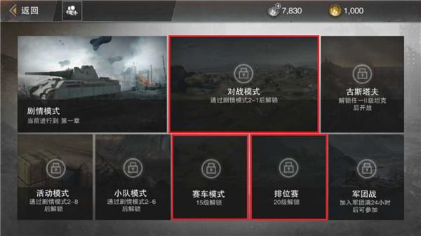 完成第二章第一节的剧情后可以解锁对战PVP模式;还有排位战,赛车模式,需要通过个人等级去解锁哦~