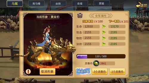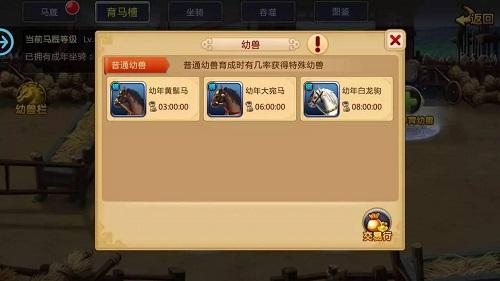 当你达到50级后将开启完整的坐骑系统,跟随胡莱莱的引导,首先会见到育马槽这一功能。育马槽——消耗时间培育幼兽成为成年坐骑,可以通过消耗灵兽丹加快培育时间。系统将会首先提供三种幼兽以供培育,在培育时有几率爆出稀有幽魂战马、的卢等橙紫幼兽,将其培育成年后也有几率爆出属性极佳的S级坐骑!