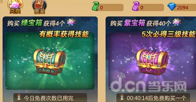 每天会有免费的技能抽取机会。技能抽取分绿宝箱跟紫宝箱两种,区别是绿宝箱的技能抽取是随机的1-3不等每次给予4点兑换石。而紫宝箱的抽取是五次必给一个3J技能,每次必给与40点兑换石。