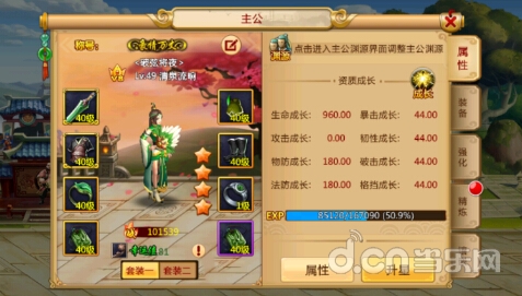 在属性界面可以看到主公所穿戴的装备,称号,星级和主公的详细属性,主公所穿戴的装备与星级是主公战力提升的主要途径,主公渊源与武将渊源一样渊源武将的星级越高,渊源武将的人数越多,提升的属性与战力越多。